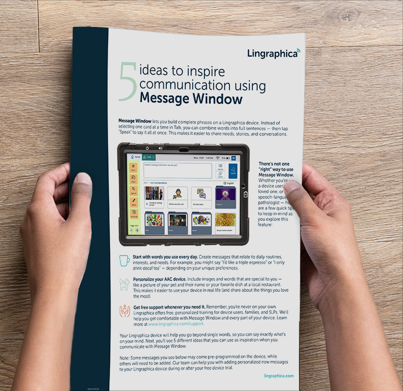While there’s not one “right” way to use it, download this free guide to inspire and help you use the Message Window feature on your Lingraphica AAC device. You can copy these phrases, create your own, or mix and match them. No matter how you set it up, your device will help you go beyond single words to say exactly what’s on your mind.