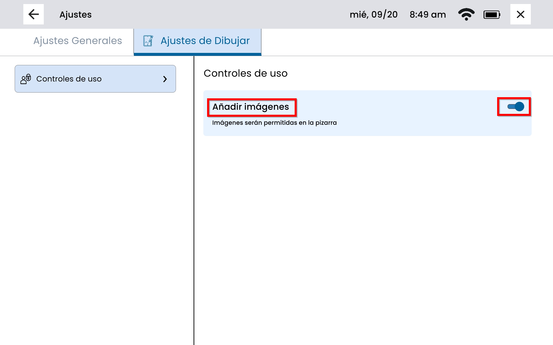 Para habilitar la adición de imágenes, seleccione el botón de alternancia junto a Añadir imágenes; el botón de alternancia se mostrará a la derecha si la Ajustes está activada y a la izquierda si la Ajustes está desactivada.
