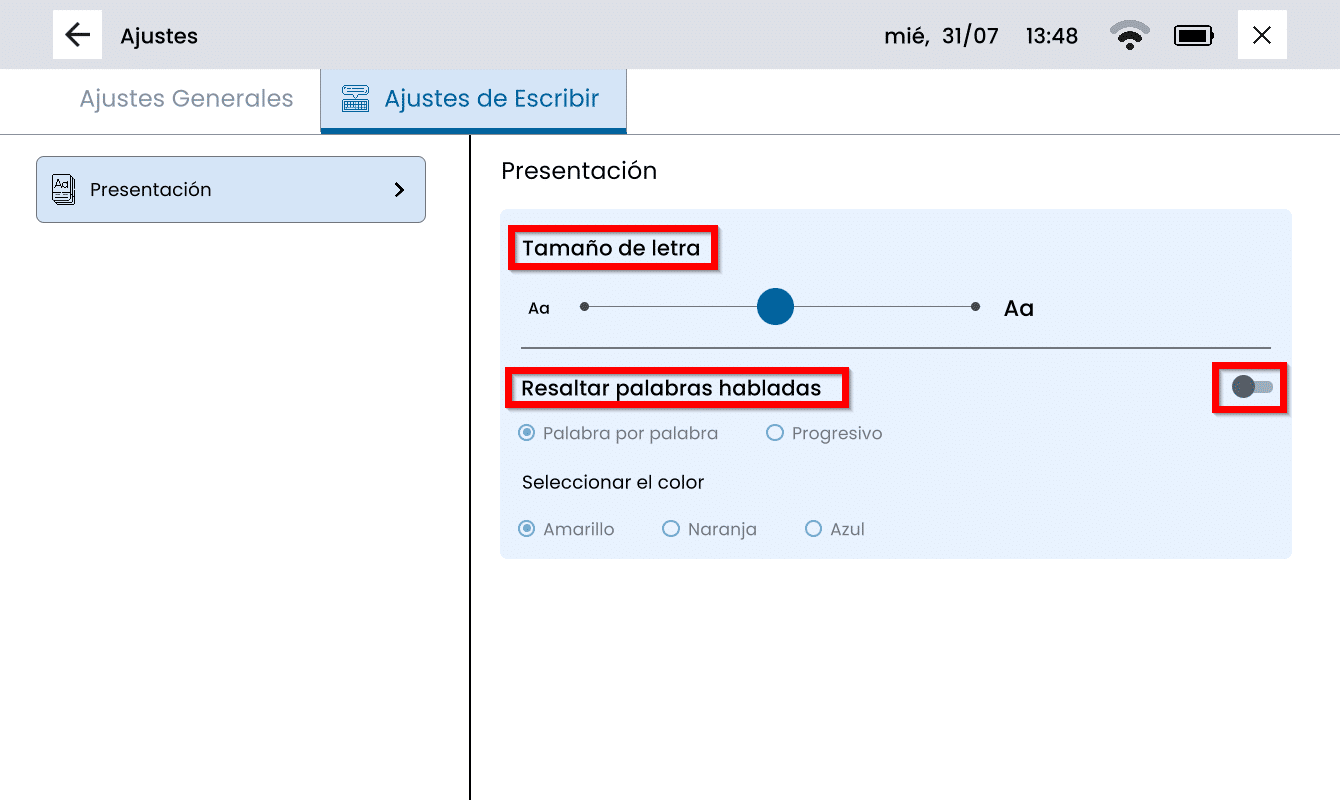 Resaltado progresivo: Esto resaltará progresivamente cada palabra a medida que se pronuncia, lo que hará que toda la oración se resalte una vez que el dispositivo haya terminado de leer la oración.
