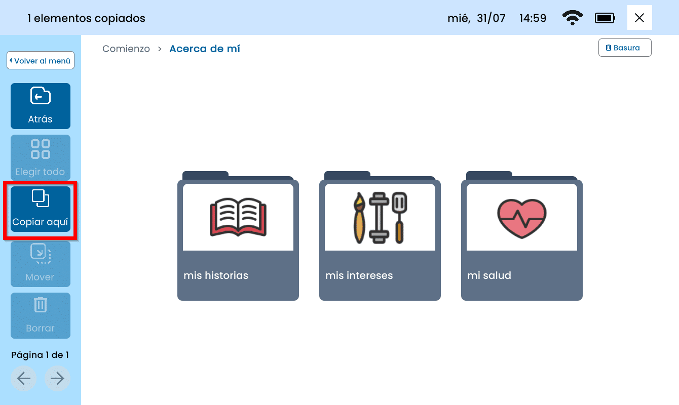 Navegue hasta la ubicación a la que desea mover la tarjeta y/o carpeta. (Toque Inicio, Atrás o en una carpeta. Seleccione Copiar Aquí.