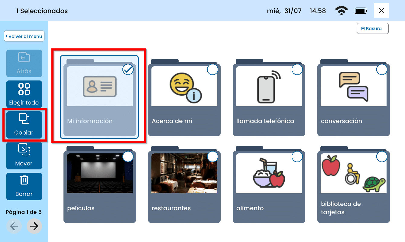 Seleccione la Tarjeta y/o Carpeta que desea Copiar. Toque Copiar.