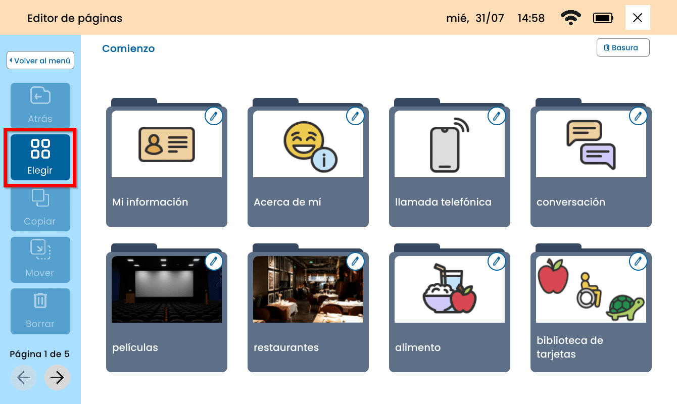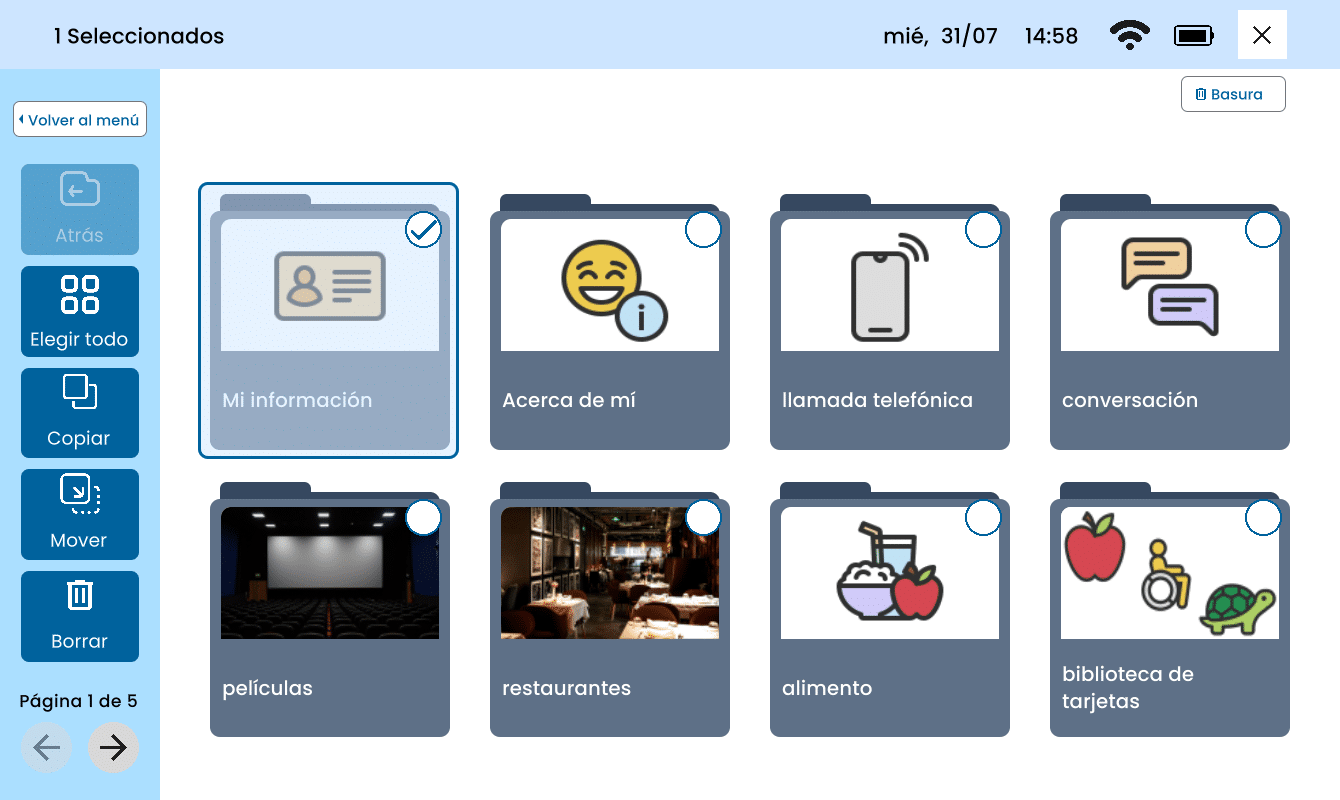 Mover: Esta opción le permitirá mover una tarjeta o carpeta a otra página dentro de la aplicación Hablar. Tenga en cuenta que al mover una tarjeta o carpeta se eliminarán de su ubicación original.