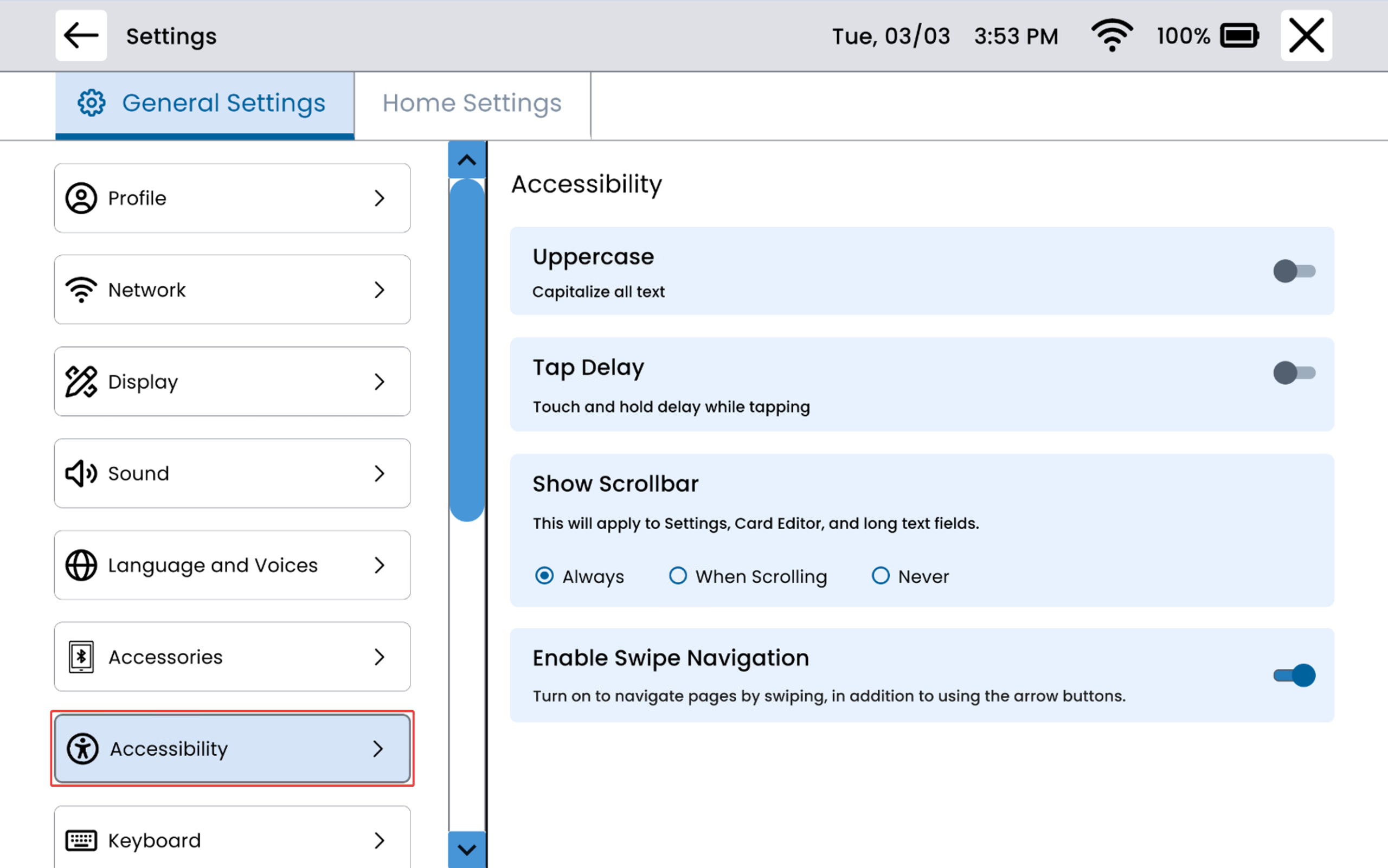 Tap Delay – Toggle on tap delay to increase the time needed for button response. When Tap Delay is turned on the toggle button will display to the right, when the setting is turned off the toggle button will display to the left.