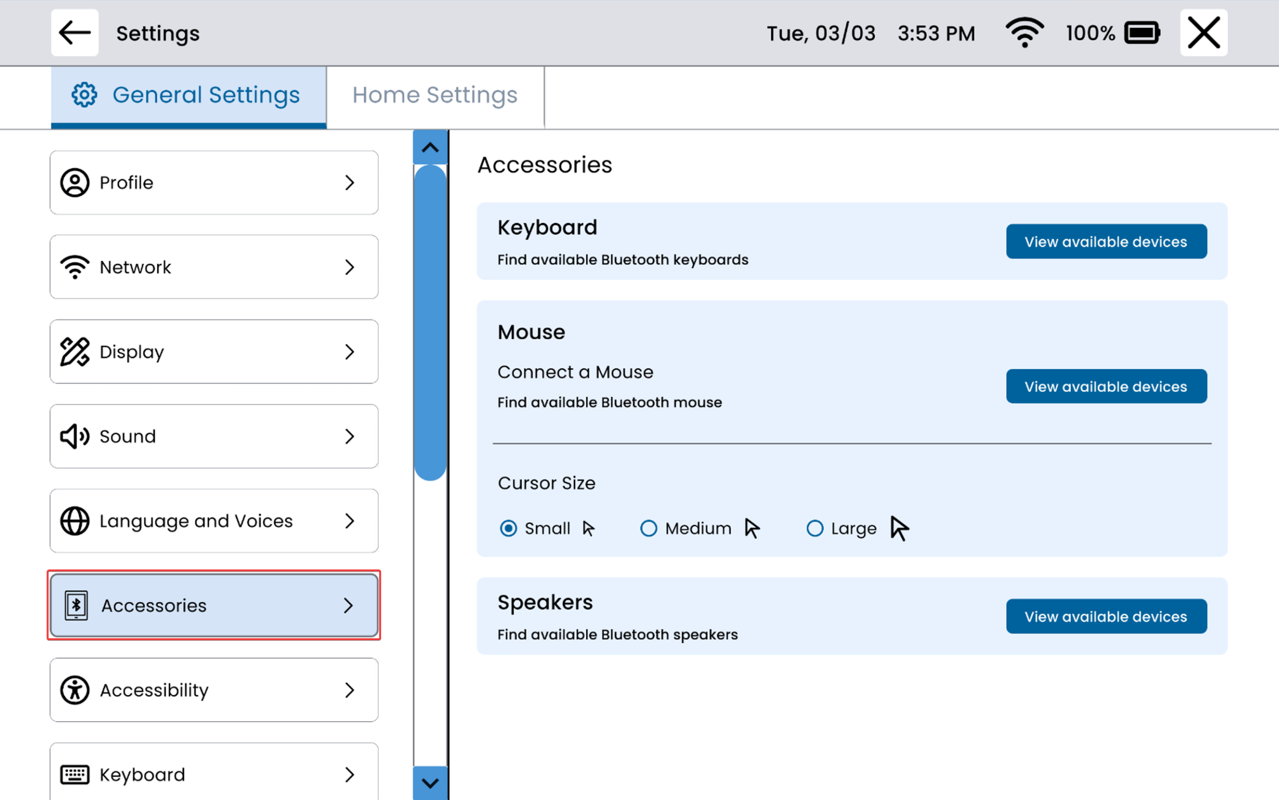 Mouse – Allows you to find and connect a Bluetooth mouse to the device. To connect a mouse, select View Available Devices and select the Bluetooth mouse from the list.