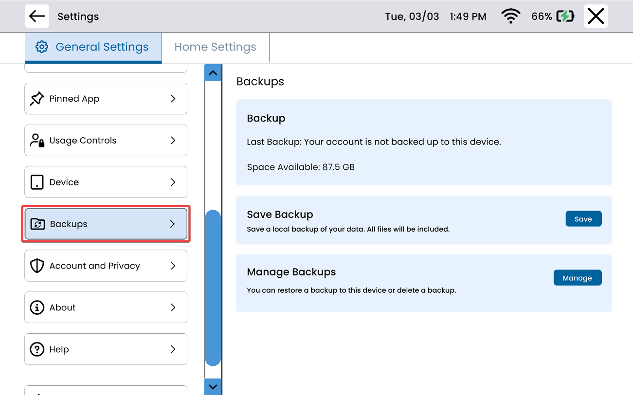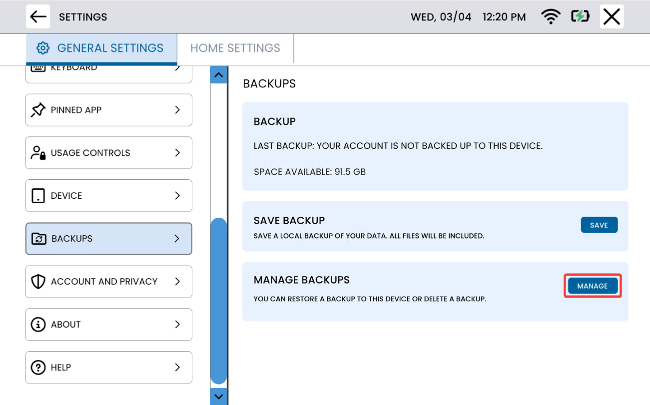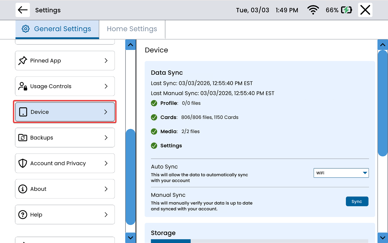Data Sync- This will provide the last time the device was synced. If you are connected to Wi-Fi the device should sync automatically anytime you make changes. If the device is offline, you will have to connect to Wi-Fi to sync any changes.