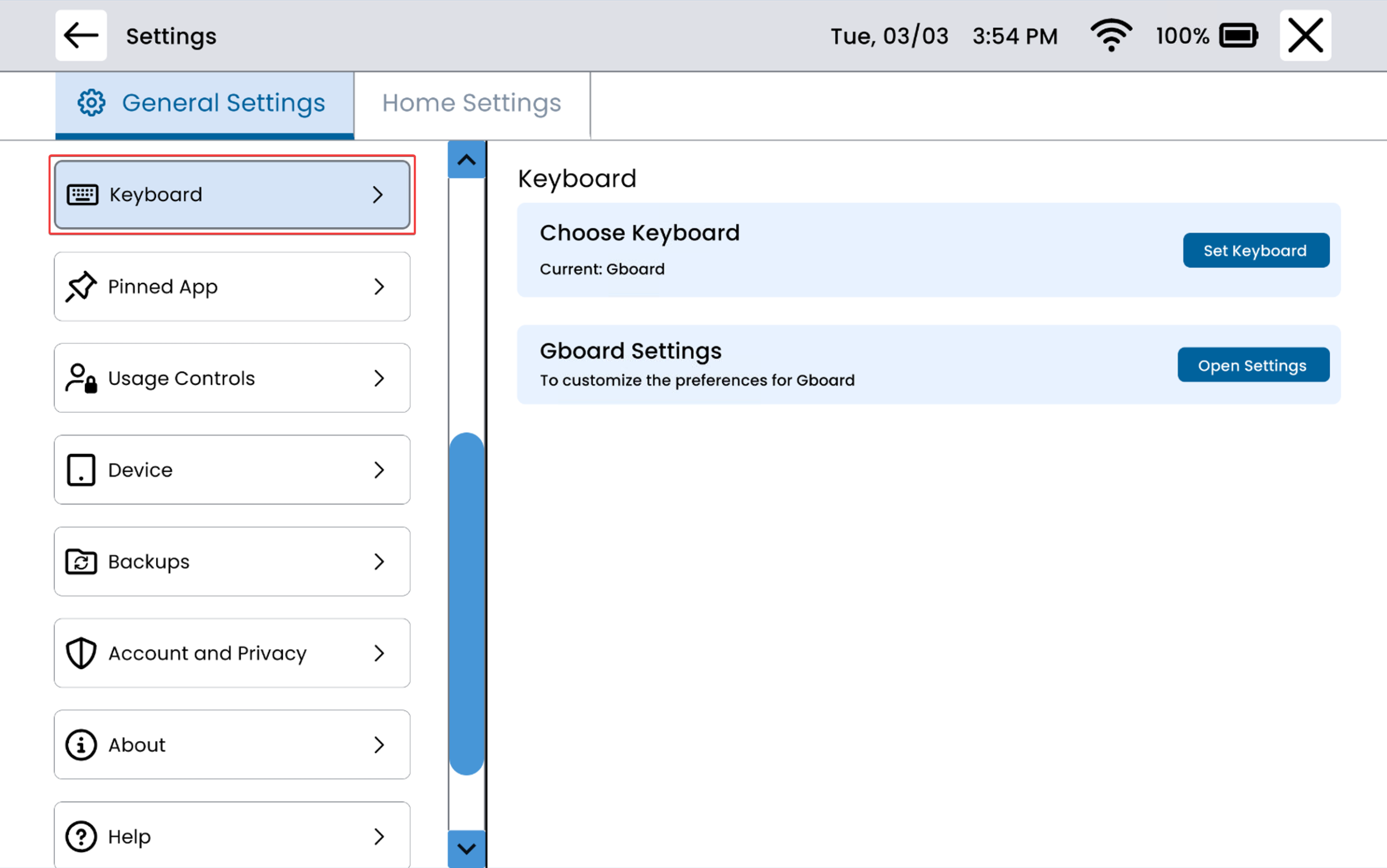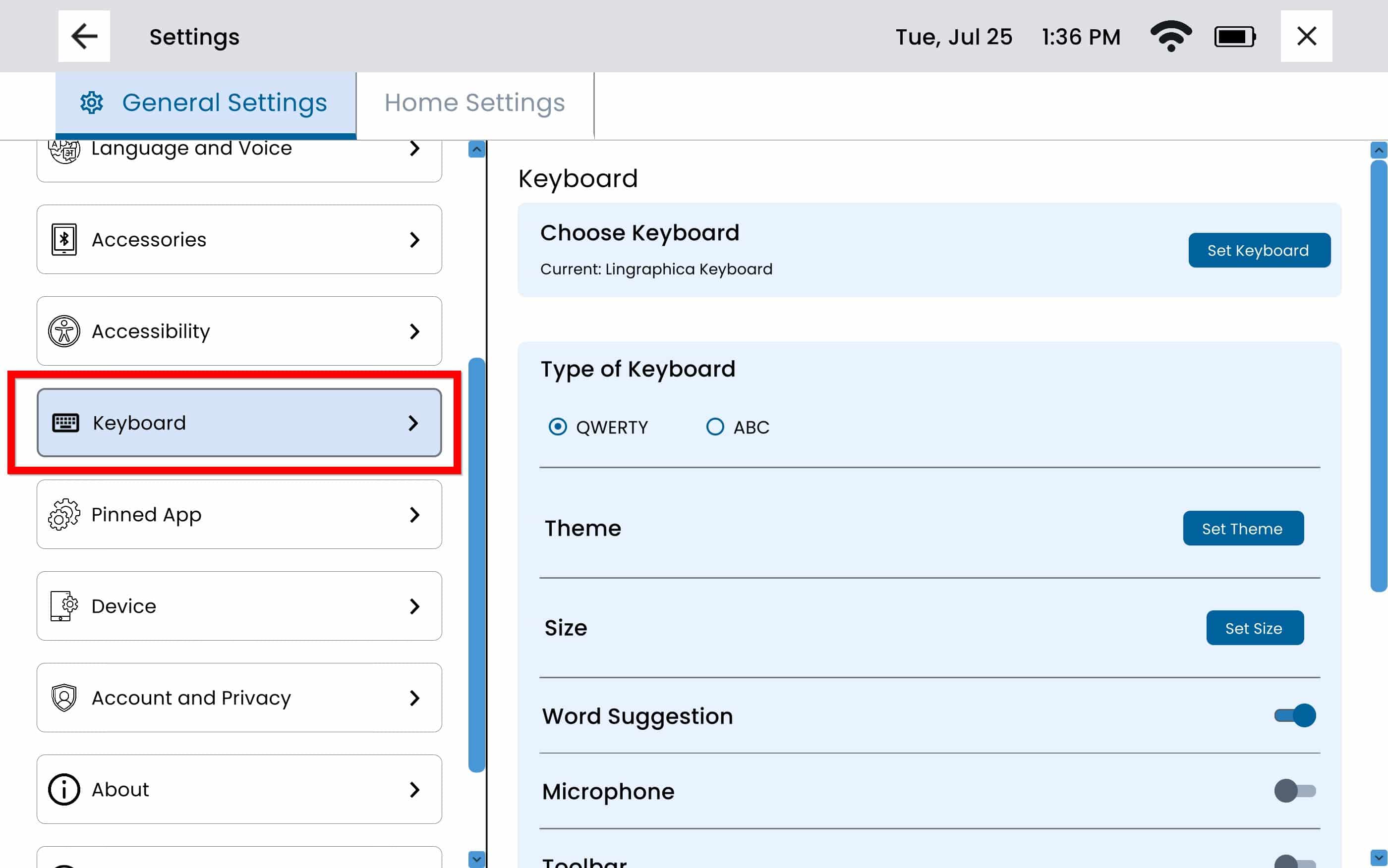 - Type of Keyboard – Select from QWERTY keyboard, or the ABC keyboard which would display keys in alphabetical order.