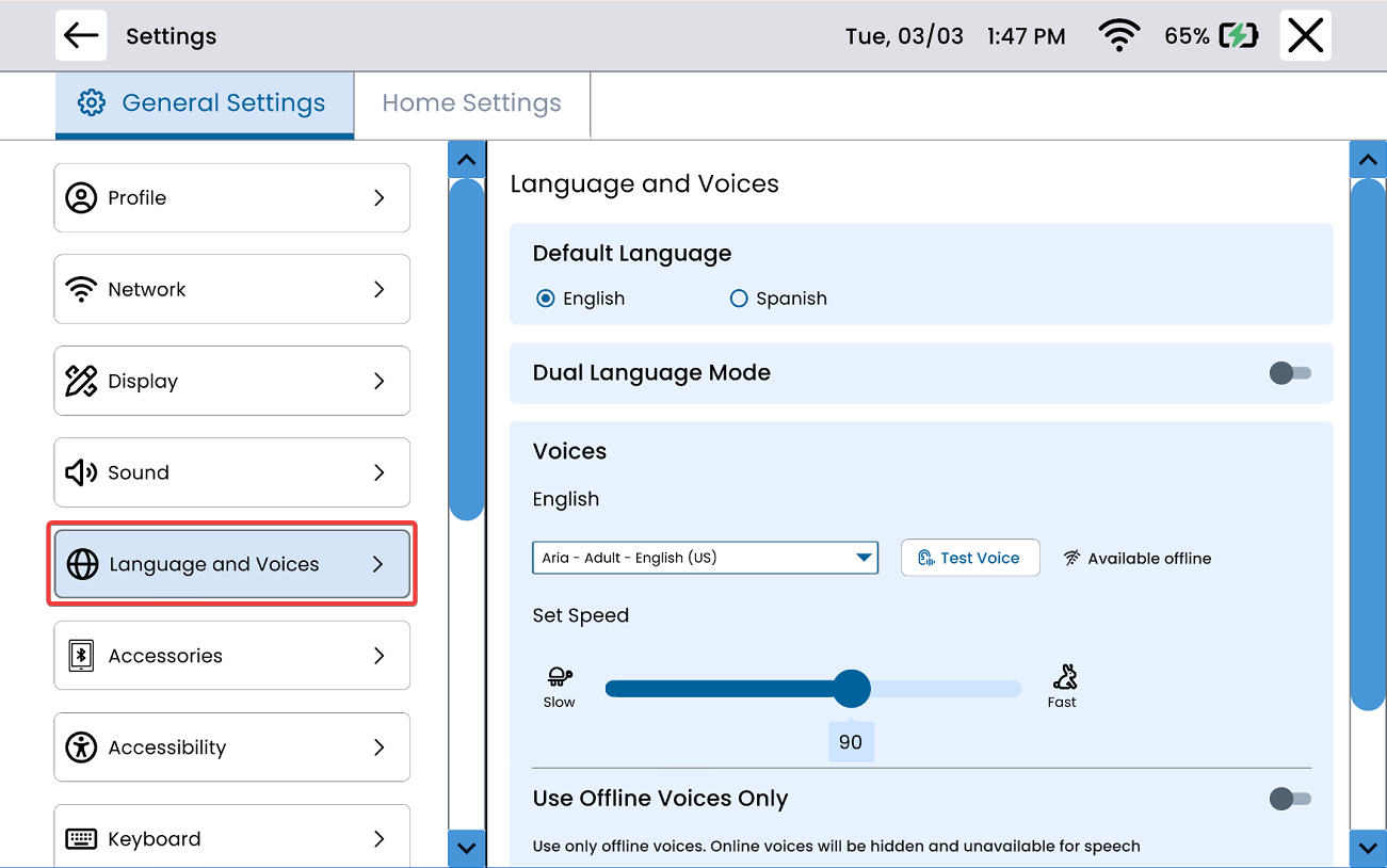• Set Speed – Adjust the voice speed by moving the toggle button. Move the button to the left to make the voice slower, and to the right to make the voice faster. You may use the Test voice option to listen to the voice speed.