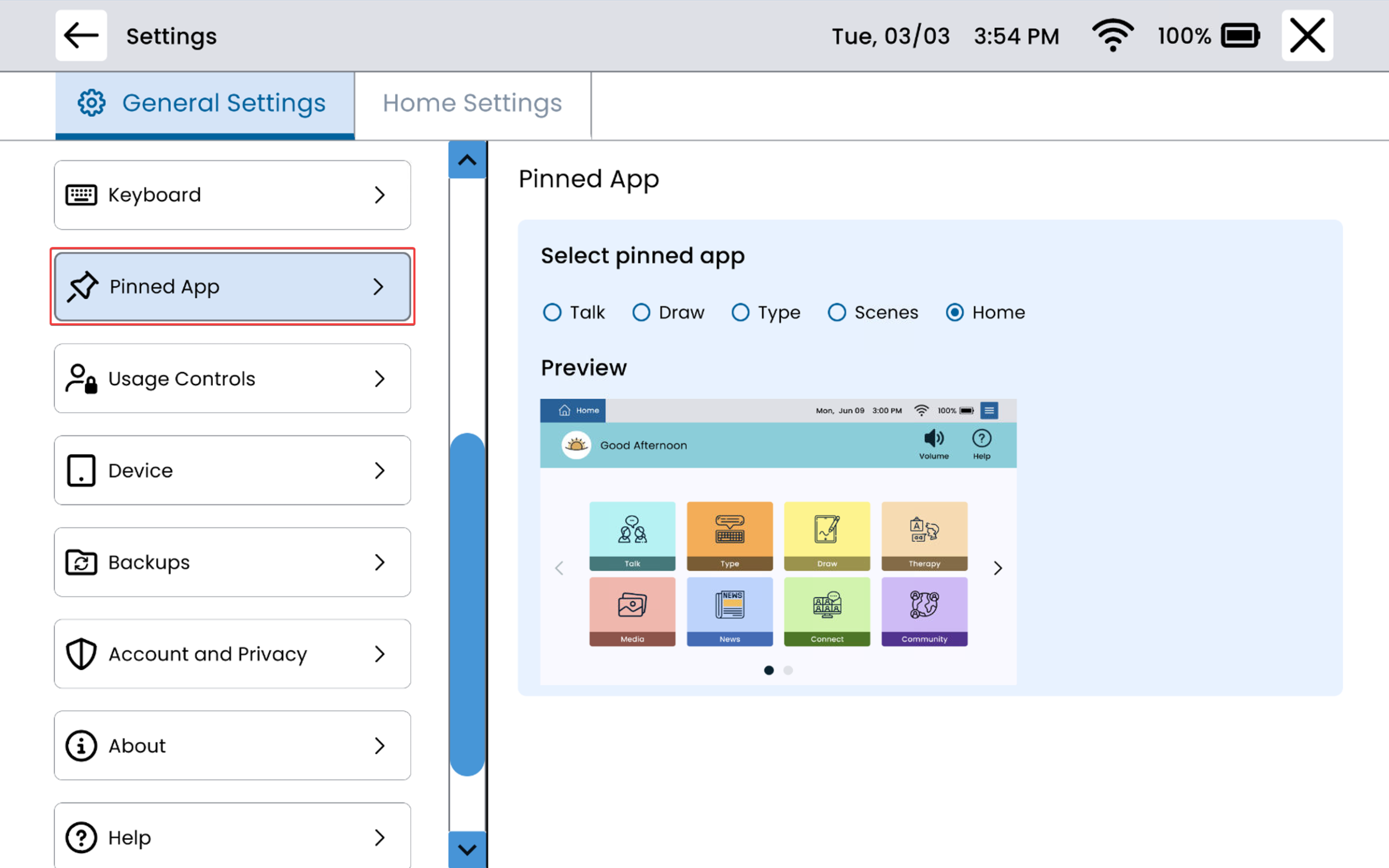 - Talk – The device will default to the talk screen. In this screen users will be able to access cards and folders created. The user will still have access to the home screen by selecting home on the top left of the page.