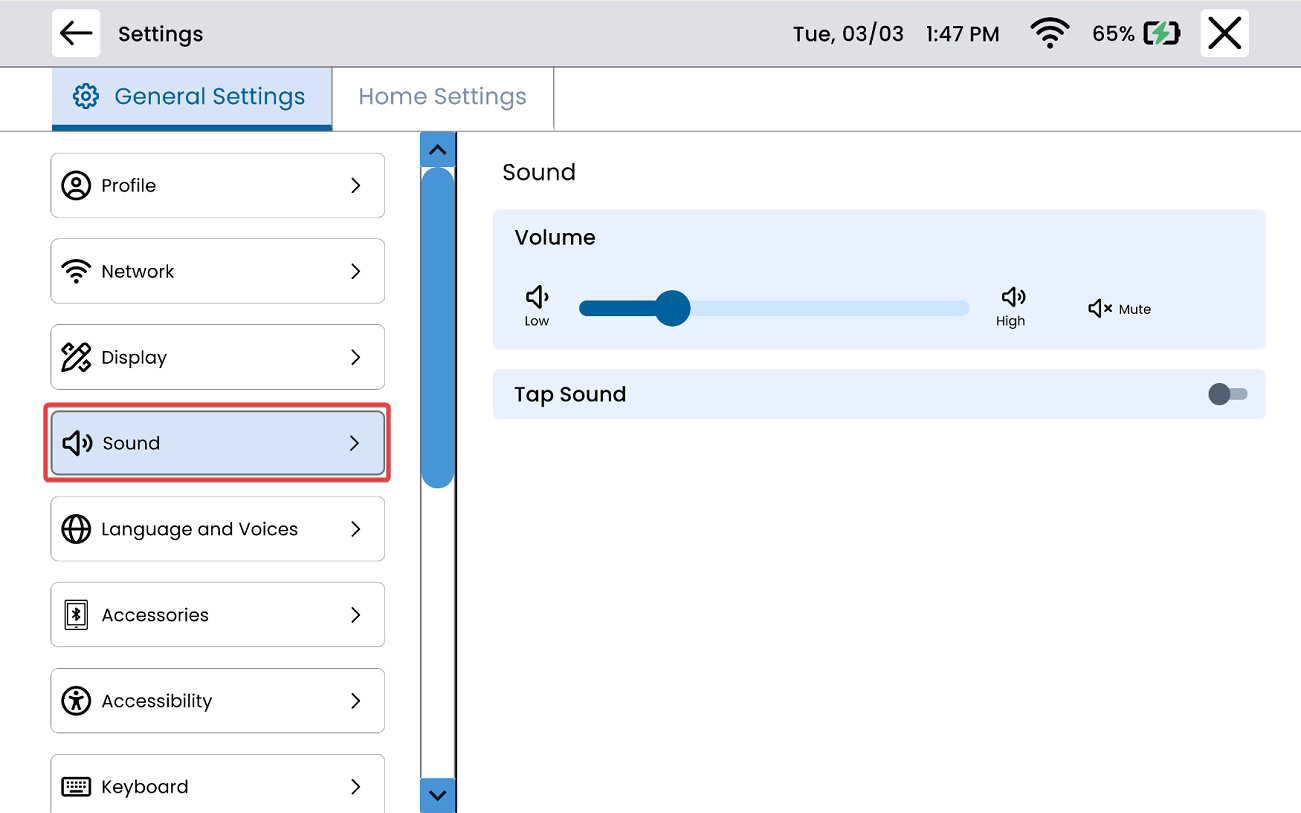 Tap Sound – Toggle on tap sound to enable the tap sound anytime something is selected. When Tap Sound is turned on the toggle button will display to the right, when the setting is turned off the toggle button will display to the left.