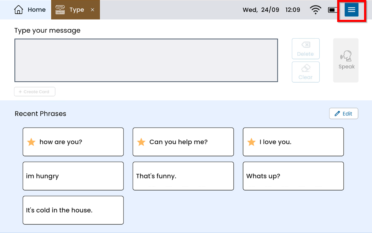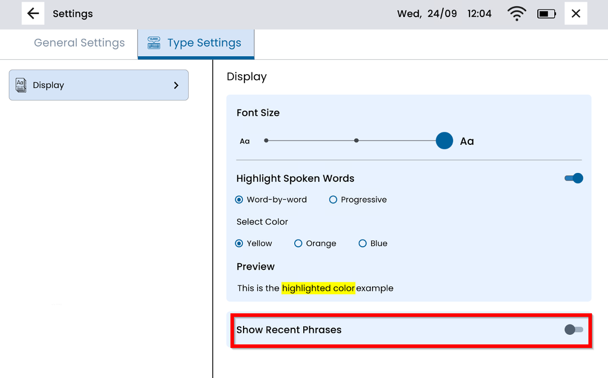 Toggle off Show Recent Phrases in the Type Settings. The toggle button will display gray and to the left when it is turned off.