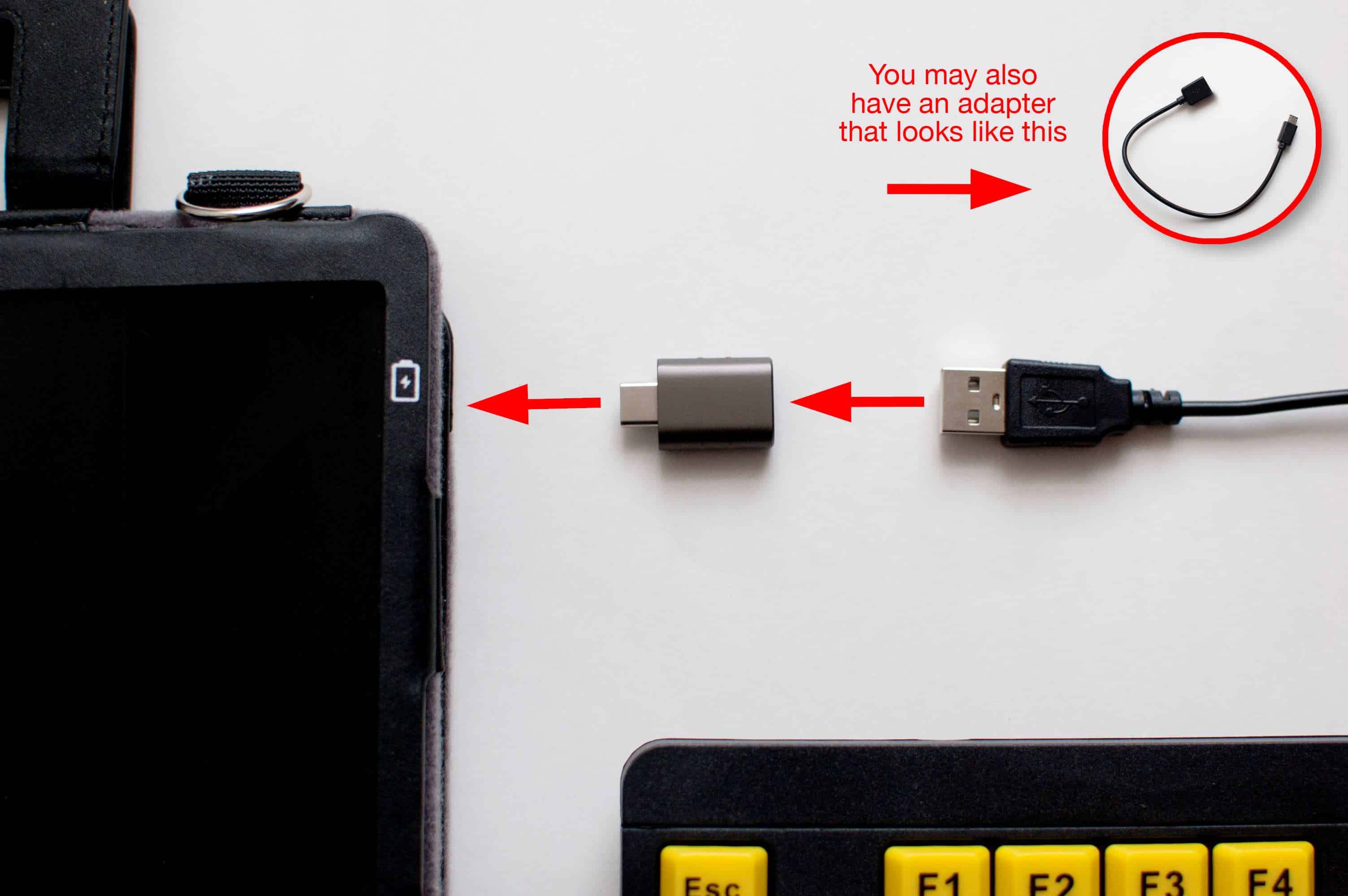 Once the device is powered down, you will need to use your USB adapter in order to connect the device to the keyboard. Connect the smaller end of your adapter directly into the tablet’s charger port. Then connect the keyboard cord to the other end of the adapter.