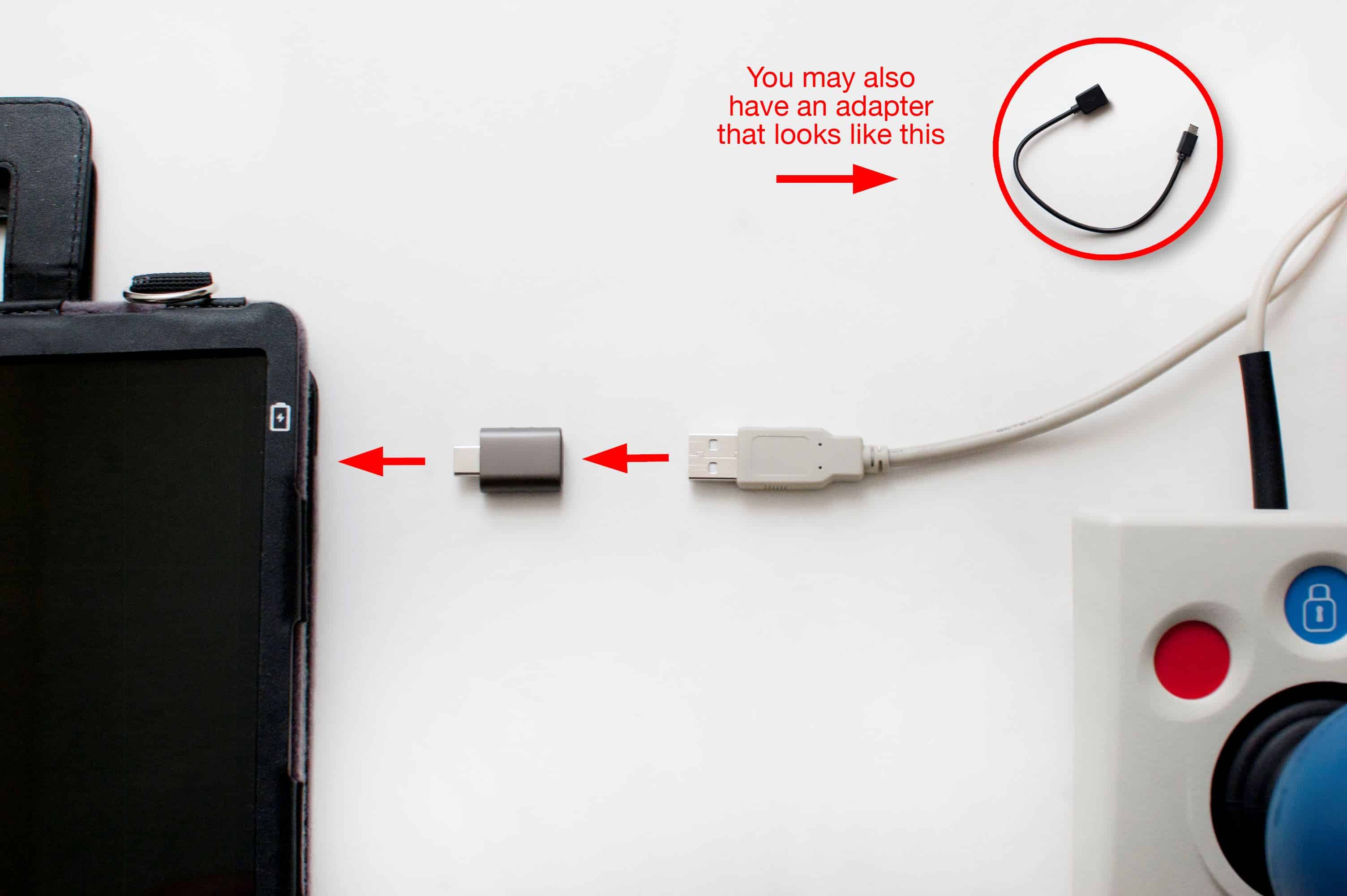 If you are using the red switch, connect it to the left-hand side of the joystick to begin using. You will now be able to use the switch to make selections on the device and the joystick to navigate the mouse cursor.