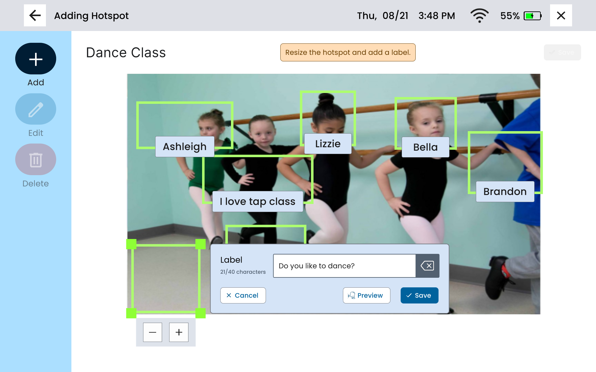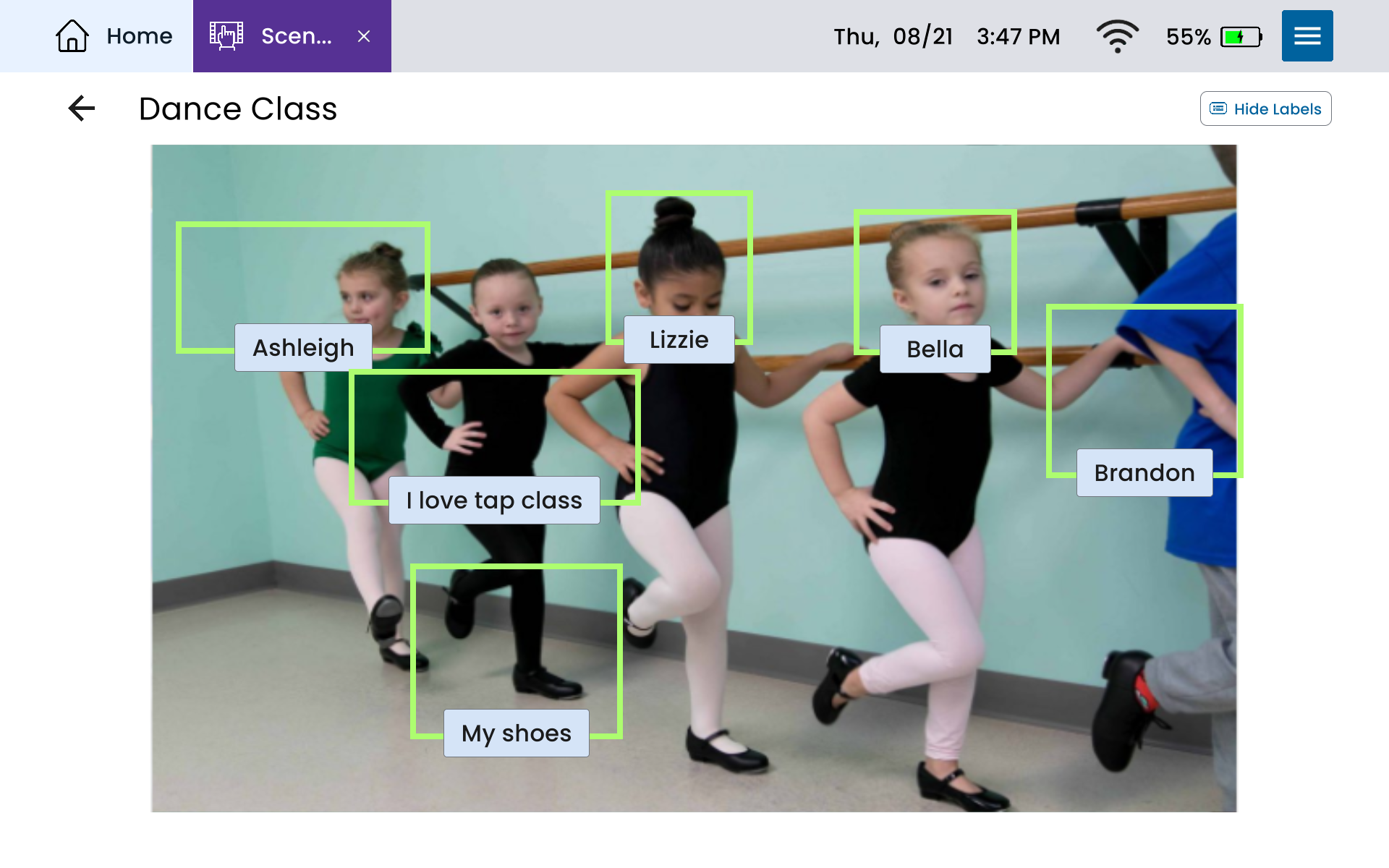 If you’re the parent of a device user, you might create a Scene to help your child talk about their dance lessons with their friends at school: