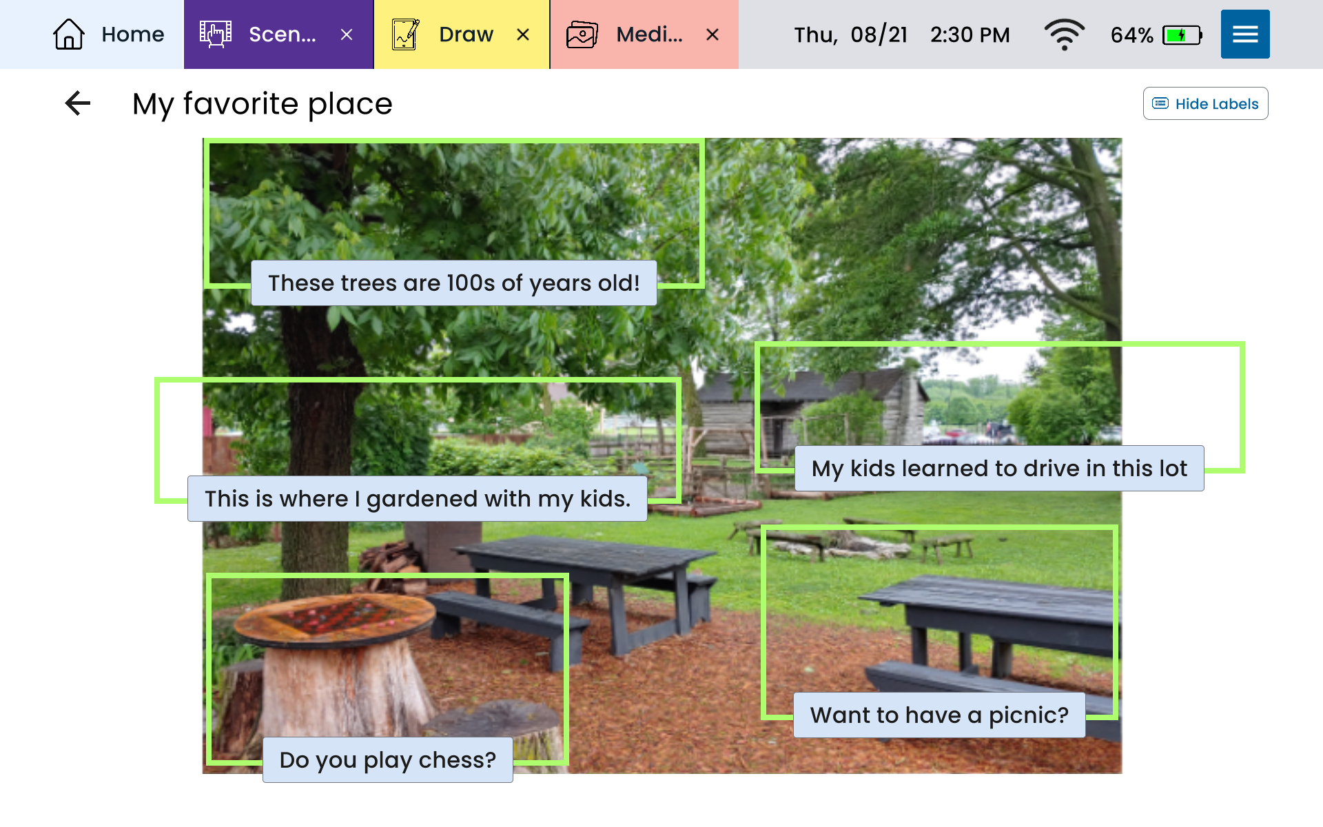 Visual scene displays (VSD) provide an easy way for AAC users to share a lot of information about an event — without needing to program long sentences or scroll through multiple pages on their device. This means Scenes is an excellent tool for sharing your favorite stories and memories!