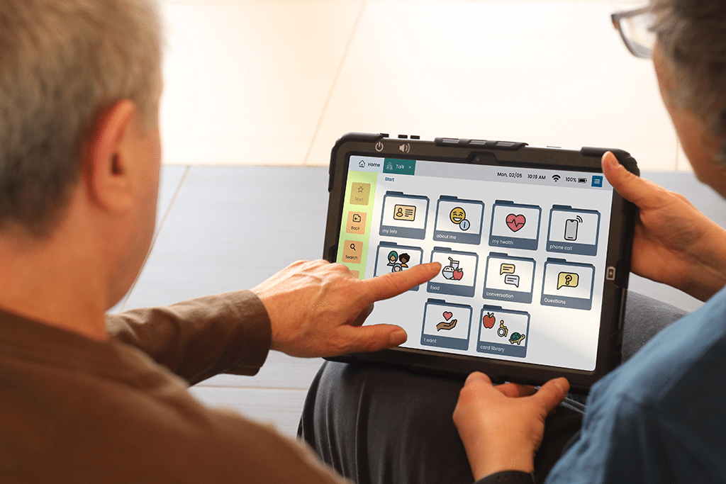 • A modular design that gives you access to communication and community all in one device. In Hub, you’ll be able to easily access communication apps (Talk, Type, Draw, and Media), therapy apps, and a community of other people living with communication challenges through Virtual Connections and the Aphasia Community.