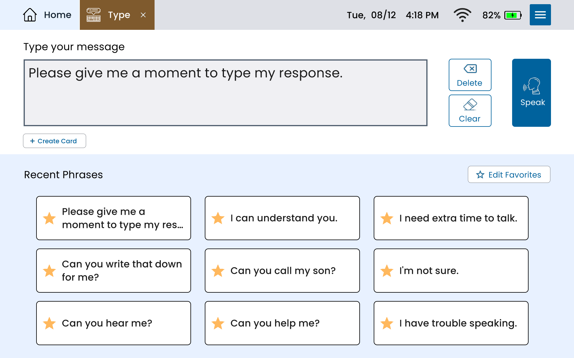 When you type a message in the Type app, it now saves automatically to your Recents list. You can also mark frequently used phrases as Favorites, making it easy to reuse them anytime. Just minimize the keyboard to access recent and favorite messages, or save a typed phrase as a new Talk Card. It keeps your go-to phrases ready when you need them.